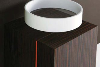 The futuristic-looking Corian Sink washbasin looks like a white spaceship hovering in thin air. The secret? The ring is fused to glass, a design that allows views of the vanity or counter-top below. Available in white, green, orange, yellow, brown, and lilac.